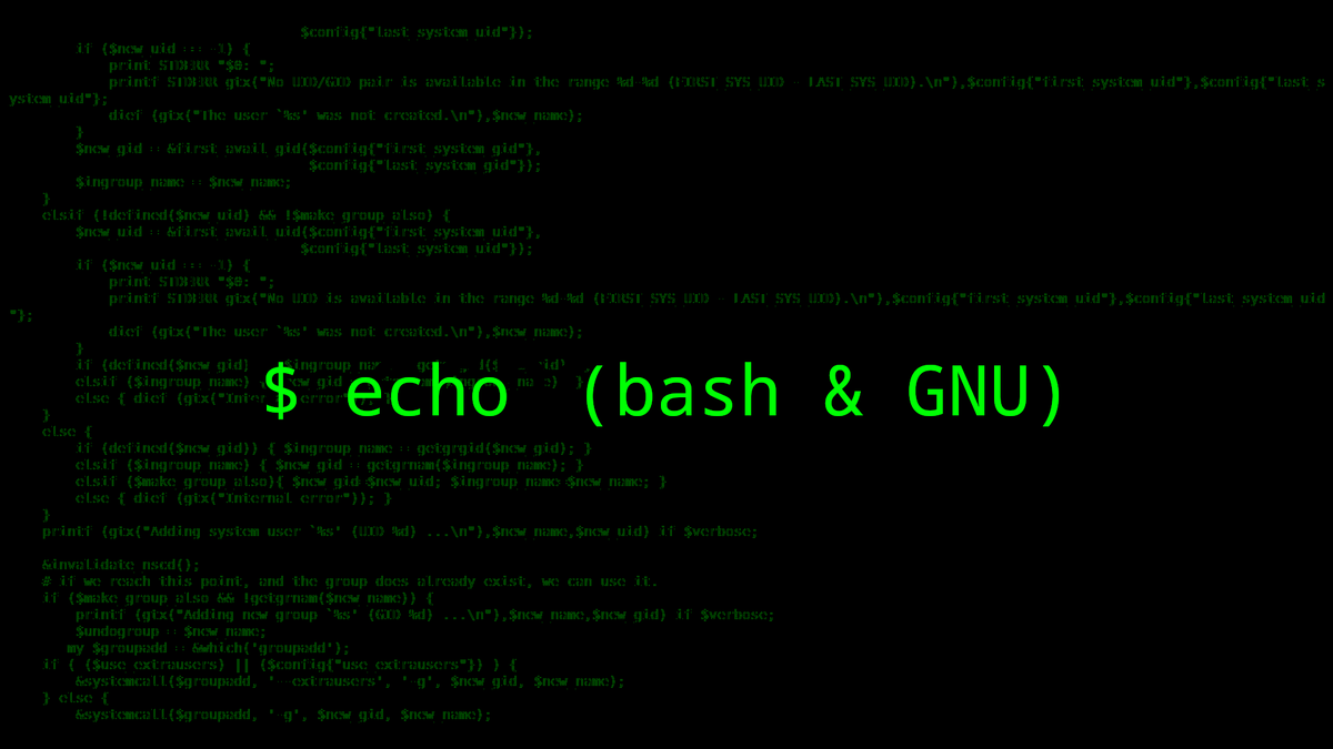 Пожалуй, каждый на первых этапах знакомства с терминалом Linux использовал команду echo, например: echo "Hello, Linux!" echo — это утилита в составе GNU coreutils или командной оболочки, например, bash. Предназначена для вывода строк в stdout. echo [ПАРАМЕТР] [СТРОКА] В случае использования утилиты в составе GNU coreutils (/bin/echo) добавляются ещё 2 параметра: При использовании параметра -e будут распознаны следующие последовательности: Выполним в терминале команды: echo "Hello, world!" echo -n "Enter your name: "; read В первом случае после вывода Hello, world! будет выполнен перенос строки, во втором - нет, т.е. приглашение командной строки будет следовать сразу за выводом: Второй вариант удобен в случаях, когда нам нужно оставить курсор на той же строке или когда программа, считывающая данные из стандартного потока ввода чувствительна к любым символам. Например, вычисляя хэш-сумму, можно забыть про перенос строки после вывода echo и погрязнуть в траблшутинге: Для максимального о