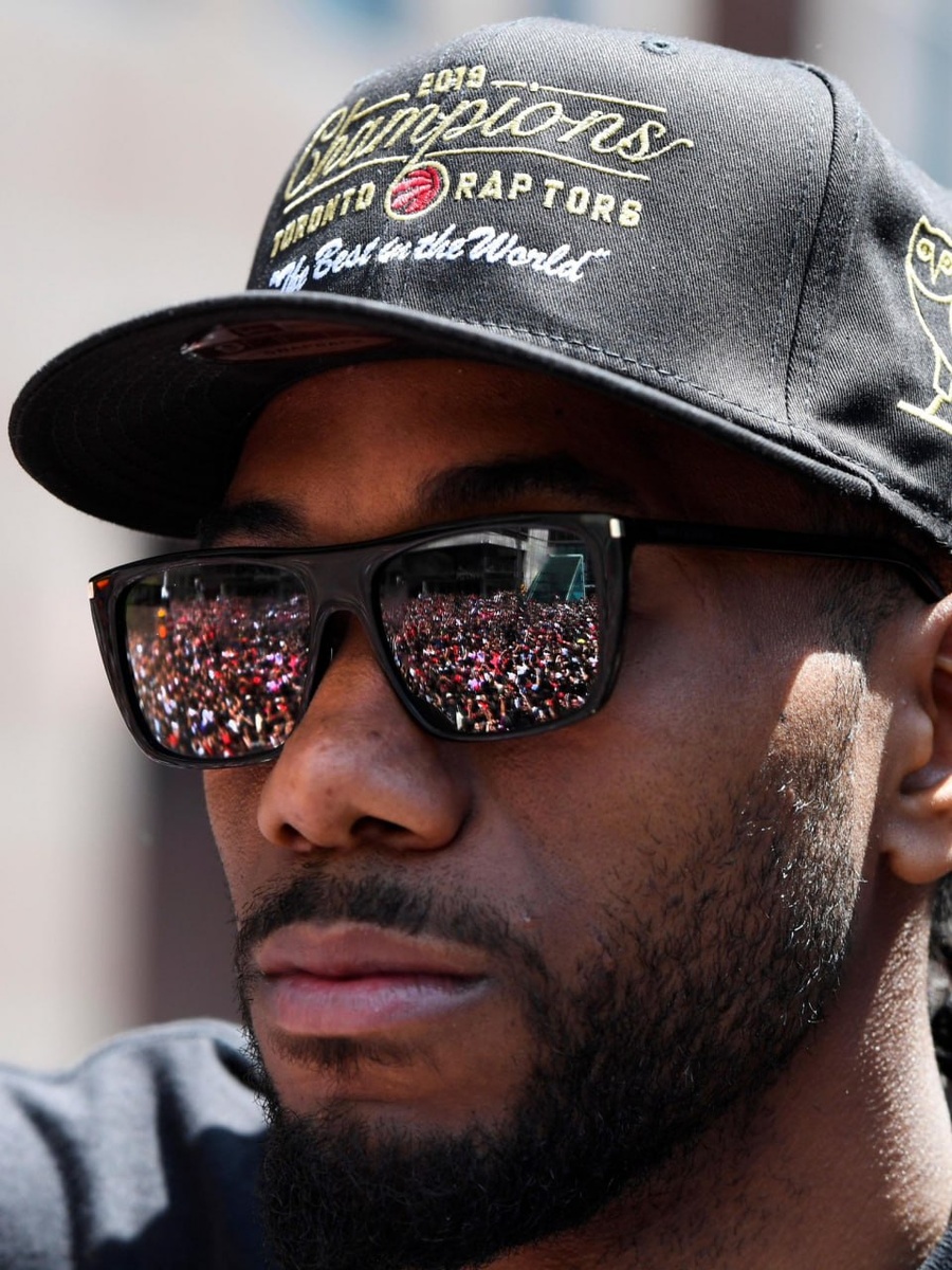 Ликующие болельщики Рэпторс в отражении очков Леонарда Кавайя на чемпионском параде в 2019 году