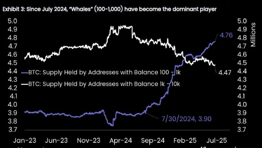 https://basechop.ru/wordpress/?p=49629 В тихом омуте черти водятся. Внешне кажется, что жизнь на рынке биткойна затихла. Вот уже который месяц котировки BTC/USD блуждают в относительно узком торговом диапазоне, а волатильность упала до минимальной отметки за два года. Однако на самом деле жизнь бьет ключом. Под поверхностью воды криптовалюта переходит из одних рук в другие, что полностью меняет рынок цифровых активов. Согласно расчетам Flipside Crypto, еще в 2020 2% счетов владели 95% выпущенного в обращение биткойна. Такие счета получили название криптокитов. К ним принято относить майнеров, оффшорные фонды и анонимные кошельки. Из-за такой высокой концентрации рынка незначительные продажи токенов приводили к существенным изменениям цен. По данным 10x Research, отток в 2% и 9% из кошельков криптокитов в 2018 и в 2022 обвалил котировки BTC/USD на 74% и 64%, соответственно. За последние 12 месяцев такие держатели избавились от 500 тыс. биткойнов на $50 млрд. Однако все цифровые активы