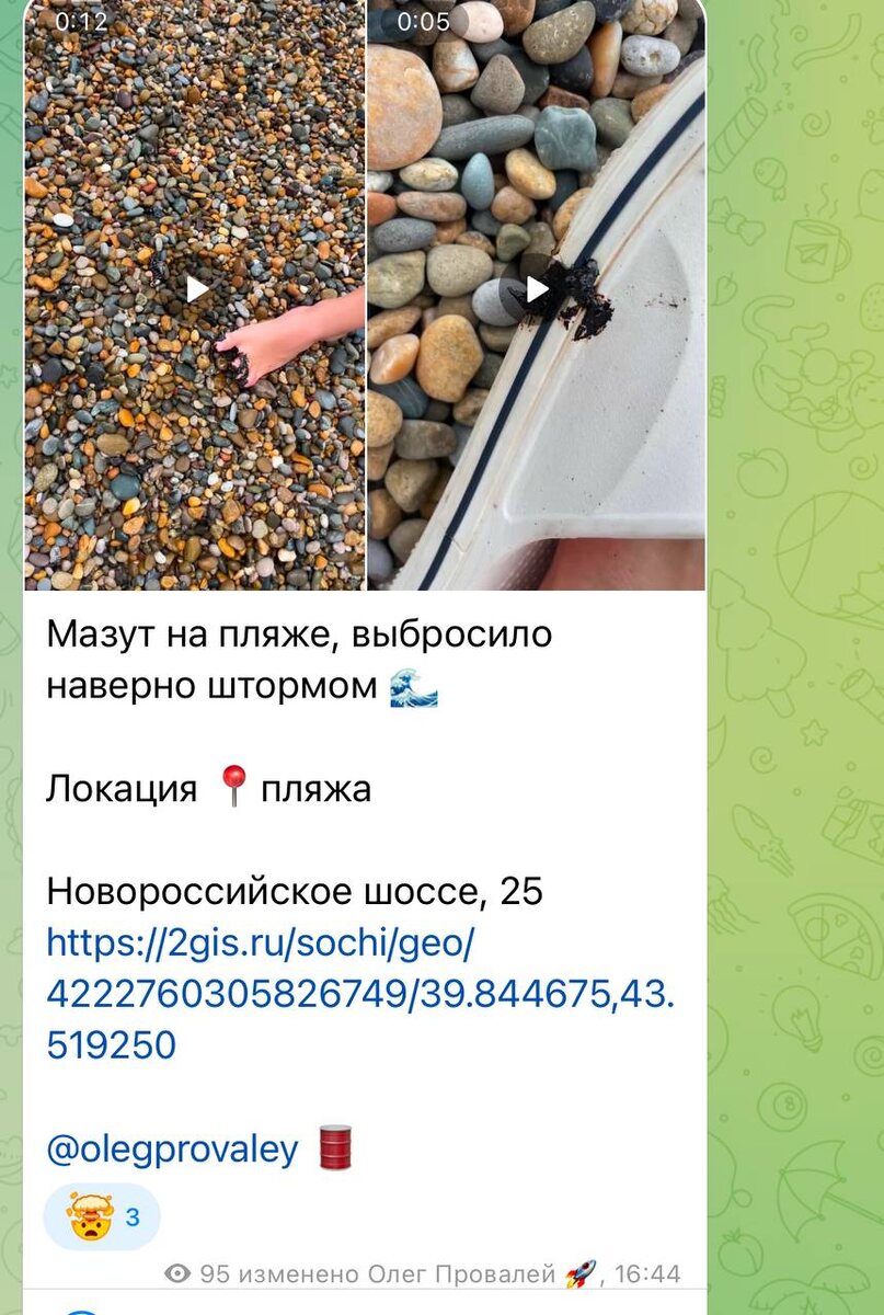 6 июля мужчина заснял на видео и заявил, что на пляже «Мыс Видный» обнаружены следы нефтепродуктов. Факт подтвердился после того, как его ребенок случайно наступил в черную смесь.