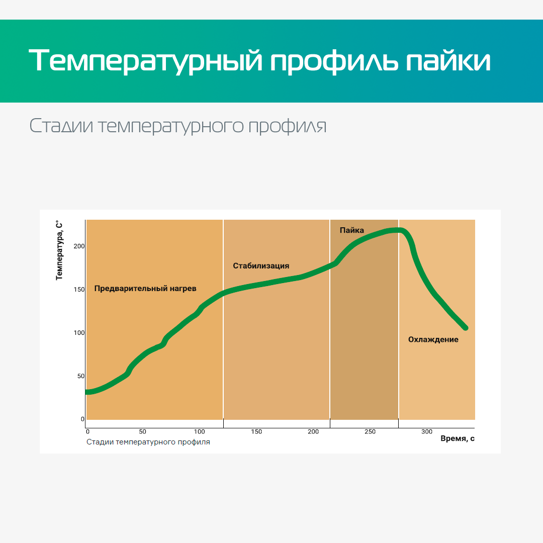 Продолжаем рассказ о температурном профиле пайки. В прошлой части мы делились основными факторами, влияющими на формирование температурного профиля пайки — ознакомиться с ней вы можете по ссылке. Сегодня расскажем об основных стадиях температурного профиля. Температурный профиль можно разделить на четыре основные стадии: 1. предварительный нагрев 2. стабилизация (зона температурного выравнивания) 3. оплавление (пайка) 4. охлаждение Нижеуказанные температуры соответствуют среднестатистической свинцовой паяльной пасте на основе сплавов Sn62/Pb36/Ag2 и Sn63/Pb37. При использовании конкретной паяльной пасты рекомендуется уточнять параметры температурного профиля у производителя данной пасты. ✅Стадия предварительного нагрева Данный этап позволяет снизить тепловой удар на электронные компоненты и печатные платы. При использовании свинцовых паяльных паст предварительный нагрев рекомендуется осуществлять до температуры 95-130 С°, скорость повышения температуры для ступенчатого профиля 2-4 С°/с