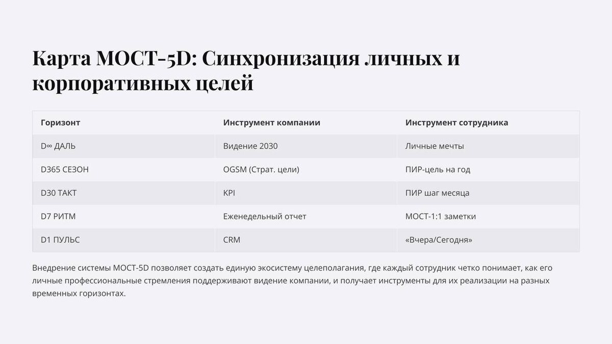 Почему ваша стратсессия не сработает? Знакомая картина: провели яркую стратсессию, заполнили флипчарты, зарядились идеями. А через месяц рутина съела все приоритеты, и о гениальной стратегии помнит только папка на диске. Почему так происходит? Потому что между сессией и результатом не хватает главного — системы. Системы, которая связывает цели компании с личными целями каждого сотрудника и контролирует движение на всех уровнях — от дня до года. В своей книге «Система МОСТ» я как раз пытался решить этот разрыв. Главный вопрос, на который она отвечает: «Как, работая у нас, человек достигает своих личных целей и одновременно двигает компанию к ее стратегической цели?» Ответ — система МОСТ, где каждая буква имеет двойной смысл, для бизнеса и для человека: Миссия компании ↔ Мотивация сотрудника Обратная связь по KPI ↔ Обратная связь по развитию Стратегия (цели) ↔ Способ роста (личный план) Точки контроля ↔ Трансформация (новые навыки) Но как превратить эту связку в ежедневную практику? Для