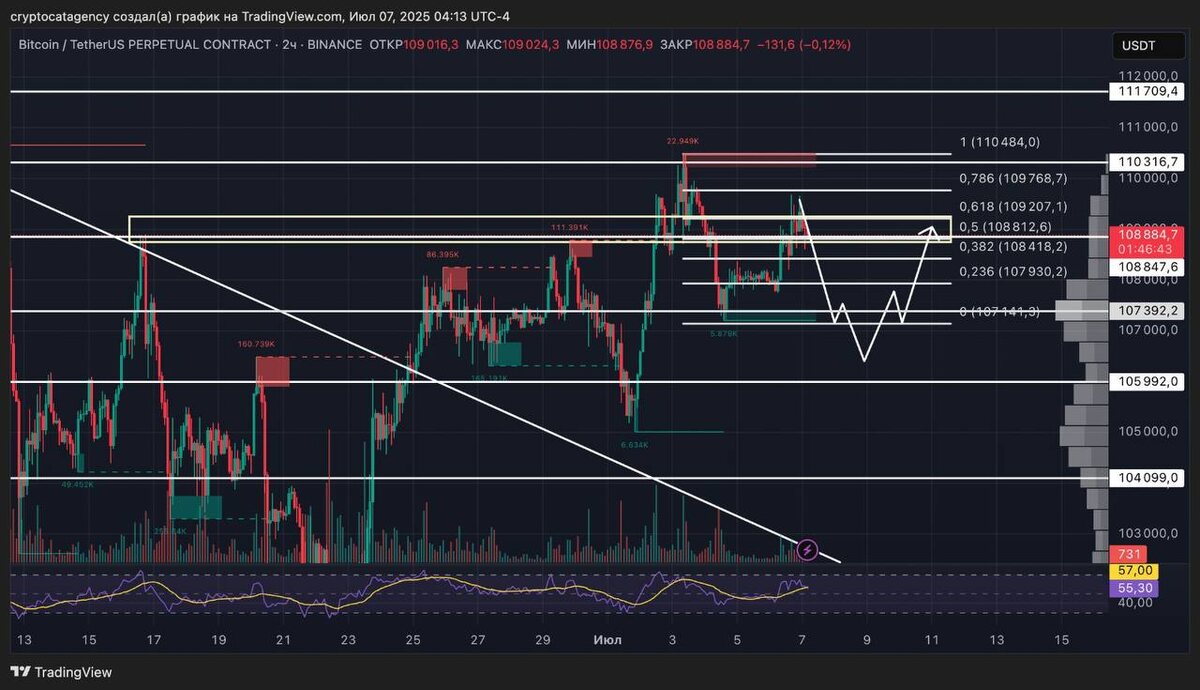 Тем временем Биткоин консолидируется, как я вам и говорил. Мы повторно протестировали первое сопротивление, которое находится около 109000$. Теперь я ожидаю увидеть некоторое отклонение отсюда или от 109250$. Имейте ввиду. Сейчас мы все еще движемся в боковике. Взято первое сопротивление по биткоину, возможно, полностью соберём ликвидность около сопротивления на уровне 109250$. Пока мы не прорвем эти уровни, рынки будут идти на коррекцию. Но если мы увидим сильный прорыв, ждите бычьей недели. Лично я считаю, что в диапазоне 107000$ - 106400$ можно рассмотреть лонги по Биткоину. Берегите себя, на этой неделе у нас будет много важных новостей, которыми я буду делиться с Вами. 👉Telegram 👉Trading View