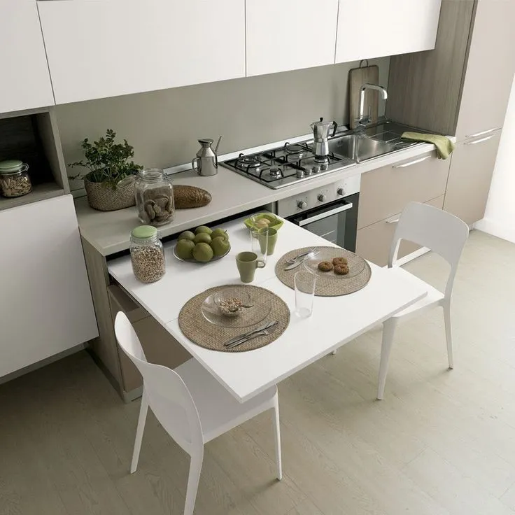 Кухня в хрущевке – это вечная борьба за каждый сантиметр пространства. Часто стандартной планировки не хватает места даже для самого маленького обеденного стола. Но отказываться от комфортного приема пищи совсем необязательно! ✅ Существует несколько функциональных и стильных альтернатив, которые помогут организовать уютную обеденную зону даже на самой скромной площади. Рассмотрим три наиболее популярных варианта: 🌸 Если вам нужен стол только на время приема пищи, складной столик станет идеальным решением. В сложенном виде он занимает минимум места, легко убирается в шкаф или угол, а в разложенном превращается в полноценную обеденную зону. Современные модели складных столиков отличаются разнообразием дизайна и материалов, позволяя подобрать вариант, подходящий к любому интерьеру. Преимущества: * Максимальная экономия пространства; * Простота использования и хранения; * Мобильность – столик можно легко переставить в любое место; * Разнообразие дизайнов и материалов. Недостатки: * О