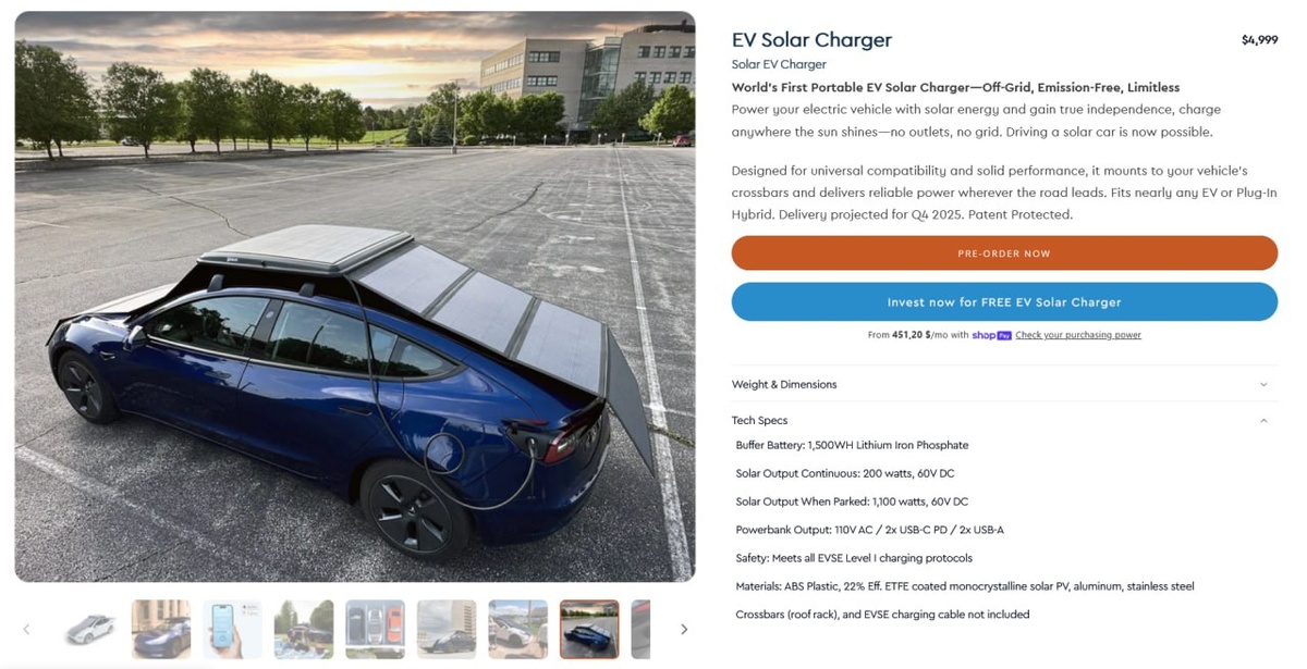 Не хочу никого огорчать, но... ...но, похоже, GoSun немножечко обманули нас в 2024-м, когда писали, что уже вот-вот и отгрузят EV Solar Charger. Сейчас статус стоит - "Q4 2024". То есть, не раньше октября. При этом можно не только сделать предзаказ, оплатив 100% от цены, но и сделать "менее рискованное" вложение, оплачивая по $451,20 в месяц (рассрочка по-нашему). Но и этот шаг, вроде как, не защищает от замораживания денег, если отгрузку будут переносить вправо и дальше. Кстати, мне показалось, или на сайте стало больше деталей? Например, что солнечная панель, которая в сложенном виде имеет мощность 200Вт и заряжает буферный аккумулятор ёмкостью 1,5кВт*ч, а в разложенном превращается в 1,1кВт, имеет КПД 22%. И это неплохо. Если 22% - это уже в панели. Потому что в таких модельках каждый Ватт на счету. Но вопросы, конечно, ещё остаются. Например, кто производитель ячеек? Если это Maxeon Solar - то я, в принципе, спокоен. Если кто другой - ну, я бы не рискнул вложиться первачком, что