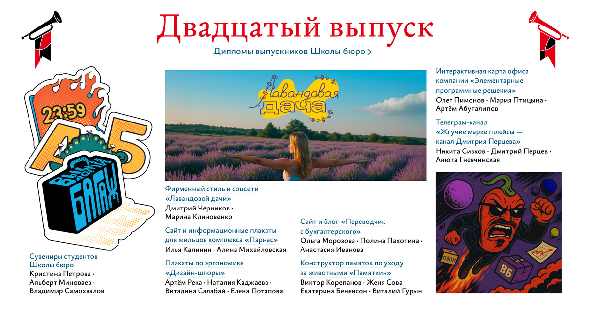 В июне был двадцатый выпуск Школ дизайнеров, редакторов и руководителей. На сайте бюро опубликованы дипломные проекты выпускников — продукты с клиентами и пользователями.