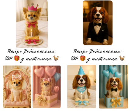 Промт для питомцев Как сделать: Открываем бот Syntxai - "Дизайн с ИИ" - "🌙 SORA Images" #животные Больше промтов в моем канале - нажать Загружаем фото + промт Промт 1: Создайте реалистичное изображение собаки с фото, сидящей на белой кровати. У собаки на голове — розовая корона, а на шее — яркая лента с надписью "Happy Birthday". Перед собакой — праздничный торт в форме косточки, украшенный розовой лентой и с зажженной свечой посередине. Вокруг — мягкое освещение, создающее уютную и праздничную атмосферу. Обстановка — светлая, чистая, с нежными деталями, подчеркивающими торжество и тепло. Стиль — милый, уютный, праздничный, с акцентом на милого питомца и атмосферу праздника. Промт 2: Создайте очень детализированное, милое и элегантное фото собаки с фото, сидящей внутри роскошной розовой мягкой кровати в виде кареты. У собачки большие выразительные глаза, она одета в нежное пастельное платье с тонкой вышивкой. На голове — большой мягкий розовый бант с маленьким цветком в центре. Фон