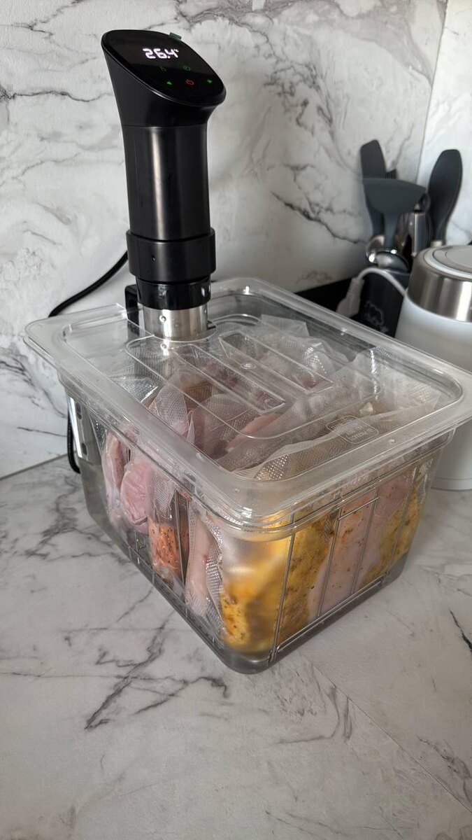 Одно и первых дел в понедельник - приготовить еду на неделю. Знакомьтесь - су-вид. Я в него закидываю мясо в завакумированных пакетах и в течение 3х часов и определенной температуре оно готовится, в результате получается нежнейшее мясо, приготовленное в собственном соку. супер полезно и не калорийно! и еще и хранить можно очень долго в холодильнике
