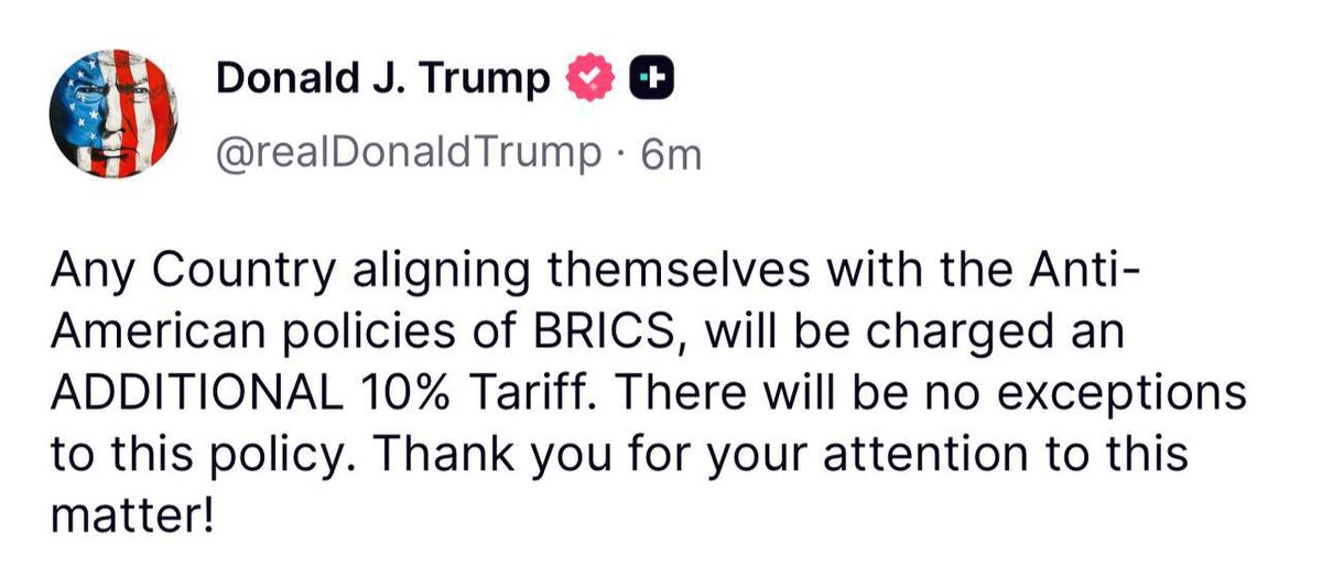 «Любая страна, поддерживающая антиамериканскую политику БРИКС, будет облагаться дополнительной 10%-пошлиной. Исключений из этой политики не будет. Спасибо за внимание к этому вопросу!»