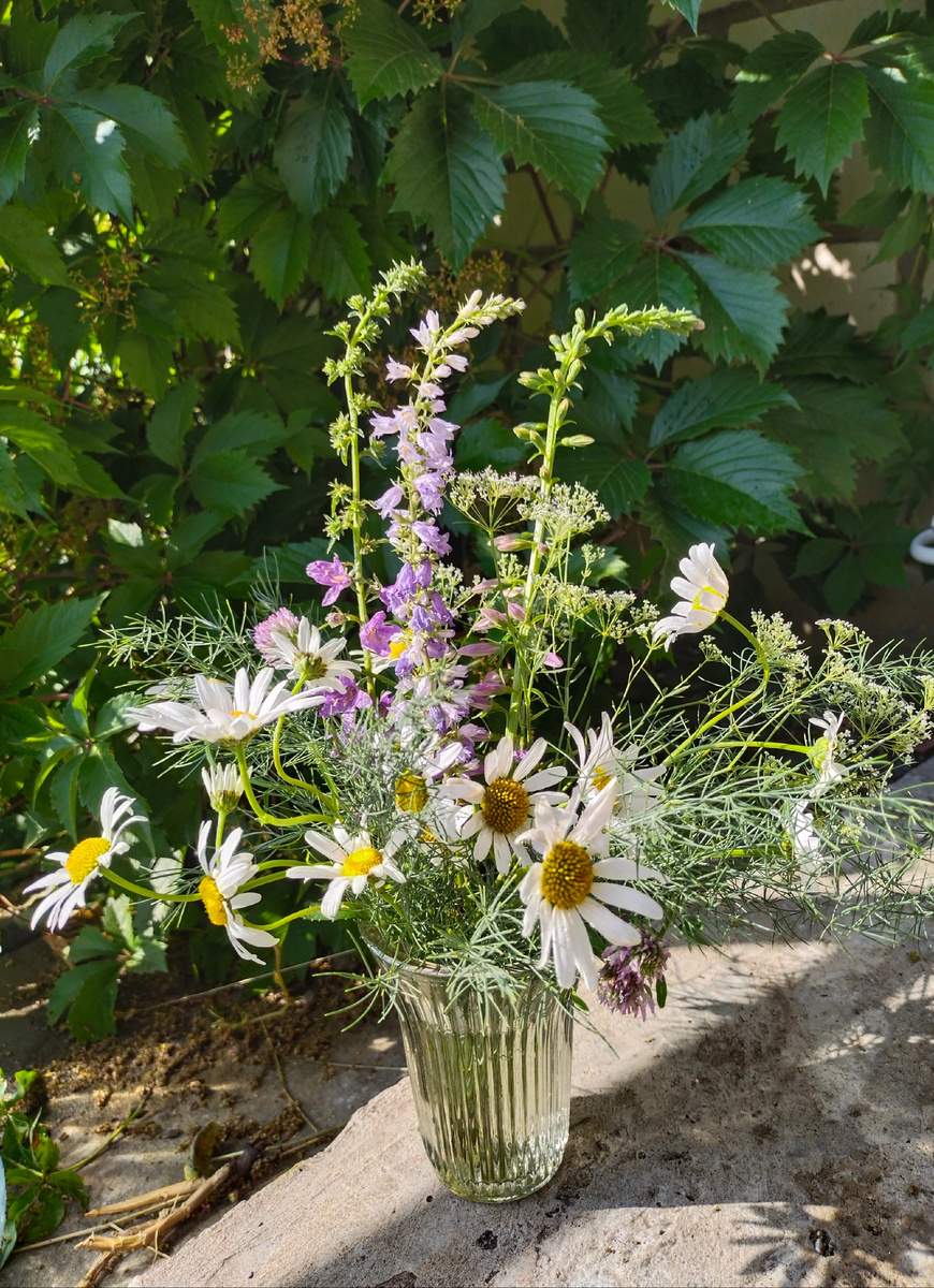 Не, ну вы представляете... Открытия каждый день. На ровном месте, если даже оно, это ровное место, на нашей горе! Вот я новый букетик составила. Вечером смотрю, из трёх колокольчиков один не жилец. Жалко, но ничего не поделаешь. Вынула его из вазы... Глаза разула... А-ба-а... Да они разные, эти колокольчики! Главное, один сорт годится для вазы, а другой - нет, не хочет! И вот он же. А второй сорт настолько дикий и свободолюбивый, что даже фотографироваться отказывается! Семь раз пробовала. Каждый раз из шезлонга вылезала, спускалась к нему. Не выходит фото, хоть ты тресни!!! Если увеличить, видно, что тут не просто бутончики на стебле, а какие-то шишковидные отростки. Наверное, только на том цветке, что в вазе, и можно разглядеть. Слева - дико гордый, два справа согласны в вазу. Вот уж не знала... Пока туда-сюда по горе шастала, вдруг заметила, сколько пчёл и шмелей над чертополохом кружится. Роятся, можно сказать. А я и забыла, что это медонос. Только про нечистую силу и помню. Чужих