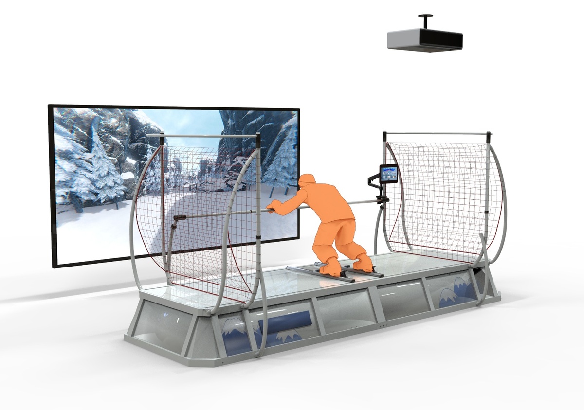 4 симулятор системы тренировок по горным лыжам – профессиональная тренировочная версия (средняя конфигурация) Смелые инновации и дизайн на основе традиционной формы катания на лыжах. Бесконечная трасса (режим тренировки) – классическая трасса без ограничений, с препятствиями, контрольными воротами, интерфейсом раздельного подсчета результатов и т.д. Основы комфортного катания и обучение. Система включает: