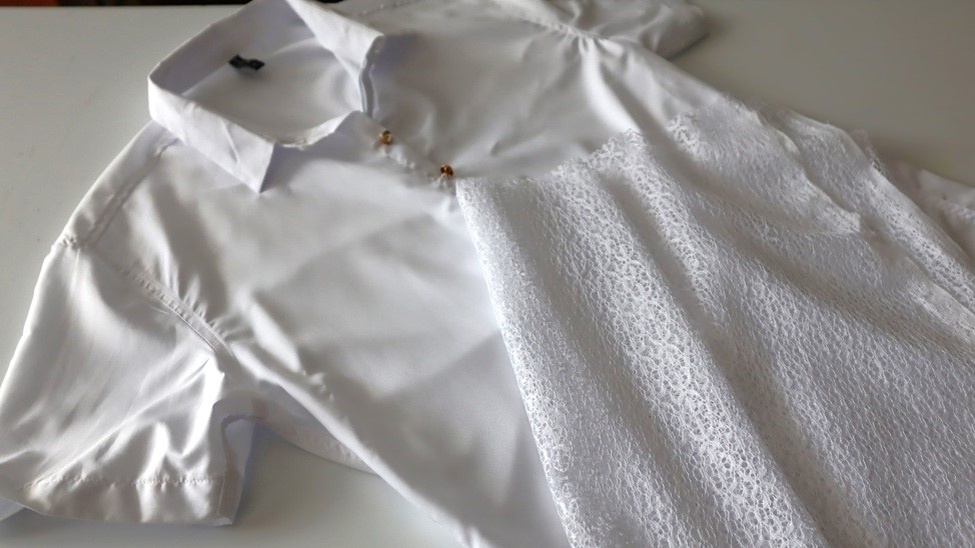 Мужские рубашки, как правило, шьют из качественной, плотной ткани. Она хорошо держит форму, не выгорает на солнце, и даже после долгого ношения выглядит достойно. Часто бывает так, что рубашка в отличном состоянии, но её больше не носят — стала мала, вышла из моды, или просто надоела. А уж белые рубашки вообще особенная тема: их надевают один-два раза, а потом она висит без дела. Поэтому такую рубашку можно легко переделать в стильную женскую блузку. Начала переделку с того, что отрезала воротник. Затем распорола боковые и плечевые швы, убрала рукава. Так рубашка превратилась в заготовку для будущей блузки. Передняя часть рубашки тоже подверглась изменениям. Полностью отпорола планки, на их место вставила кружево. Отступила от края вшитого кружева два сантиметра, начертила две линии и прострочила по ним защипы — это такие маленькие складочки, которые добавляют интересный рельеф. После этого снова разрезала передние полочки и между ними вставила ещё полоски кружева. Теперь у меня получи