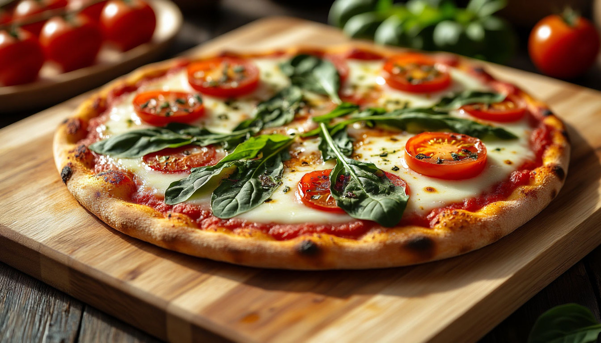 Разогрейте духовку до 220 °C, на средний уровень установите противень. Застелите рабочую поверхность бумагой для выпечки и посыпьте небольшим количеством амарантовой муки. На бумаге раскатайте тесто в тонкий круг и распределите по всей поверхности соус из помидоров. Добавьте шпинат и нарезанную кружками моцареллу. Перенесите пиццу на бумаге на горячий противень. Удобно использовать специальную лопату для пиццы или тонкую доску. Выпекайте в течение 18-20 мин и сразу подавайте, нарезав клиньями.