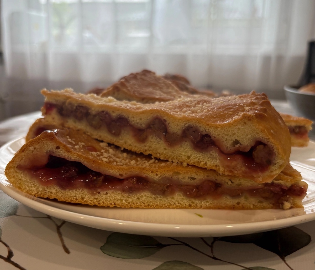 Җир җиләгеннән тәмле пирог пешерик әле. Бик тәмле була, сез дә пешереп карагыз. Эчлеге агып чыкмасын өчен бераз коры кесәл салдым, писүкне үлчәп тормадым, уч белән генә сиптем. Камырны мин гел бер рецепт белән ясыйм: гөбәдиягә дә, башка пирогларга да. — бер бокал жылы сөт, — 100 гр атланмай, яхшы сыйфатлы маргарин да ярый (эретеп салам), — ике йомырка, — ике аш кашыгы писүк, — бел балкашык тигезләп кенә тоз, — 15-20 гр юеш чүпрә. Барлык ингредиентларны бергә мискингә салып болгатам, 450-500 гр онны куша-куша йомшак кына итеп камыр басам. Иң ахырдан ике-өч аш кашыгы сыек май салып басып бетерәм. Ашларыгыз-чәйләрегез тәмле булсын! (Зөһрә Гарифуллина)