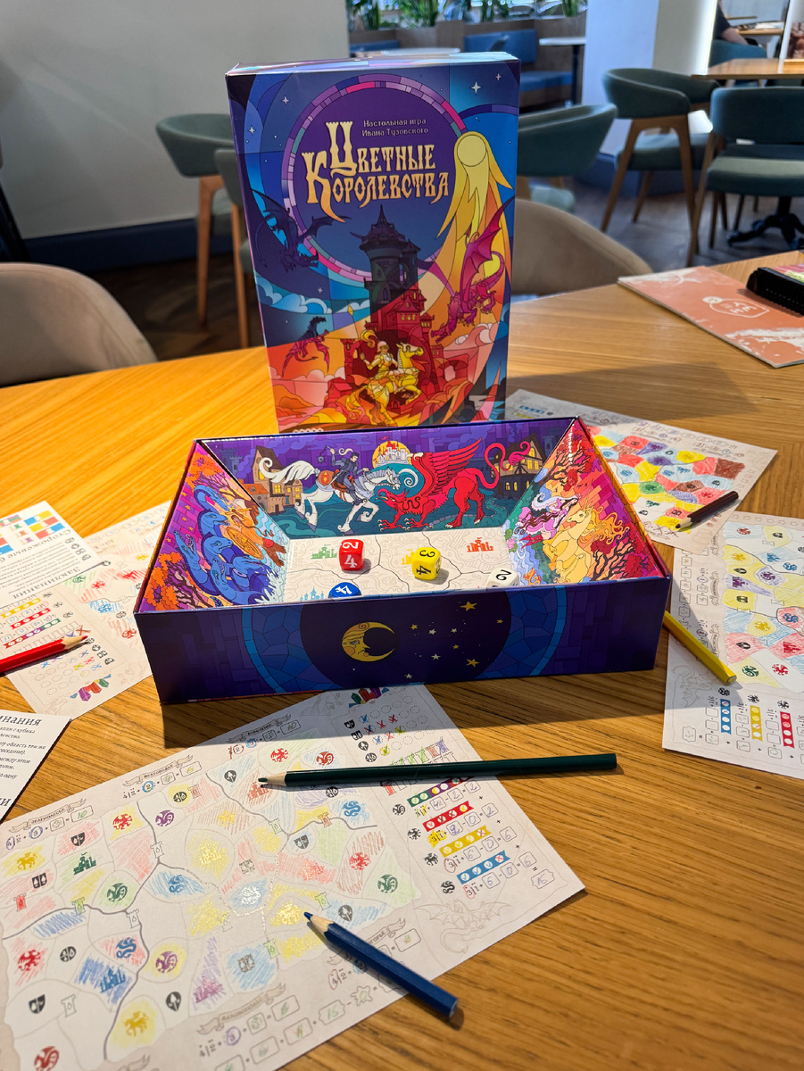 Каждый из игроков в начале партии получает лист цветных королевств, в центр стола ставится дайс-трей с кубиками и кладётся пачка карандашей — понеслась!