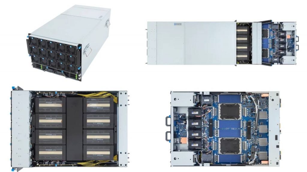 Подразделение Gigabyte — компания Giga Computing — выпустила линейку серверов на базе платформы NVIDIA HGX B200 (NVIDIA HGX B200) с восемью GPU. Новинки поддерживают как жидкостное, так и воздушное охлаждение и подходят для задач ИИ, инференса и высоконагруженных вычислений. Компания Giga Computing, входящая в состав Gigabyte, представила четыре новых сервера для задач искусственного интеллекта, инференса и ресурсоёмких вычислений. Все модели построены на платформе NVIDIA HGX B200 (NVIDIA HGX B200) с восемью графическими ускорителями формата SXM. Модель G4L3-SD1-LAX5 выполнена в формате 4U и использует прямое жидкостное охлаждение (DLC). В конструкции предусмотрены отдельные зоны для CPU и GPU. Сервер поддерживает два процессора Intel Xeon Sapphire Rapids (Intel Xeon Sapphire Rapids) или Xeon Emerald Rapids (Intel Xeon Emerald Rapids) с тепловыделением до 385 Вт. Под оперативную память отведены 32 слота DDR5-5600. Спереди установлены восемь отсеков под SFF-накопители NVMe/SATA, дополни