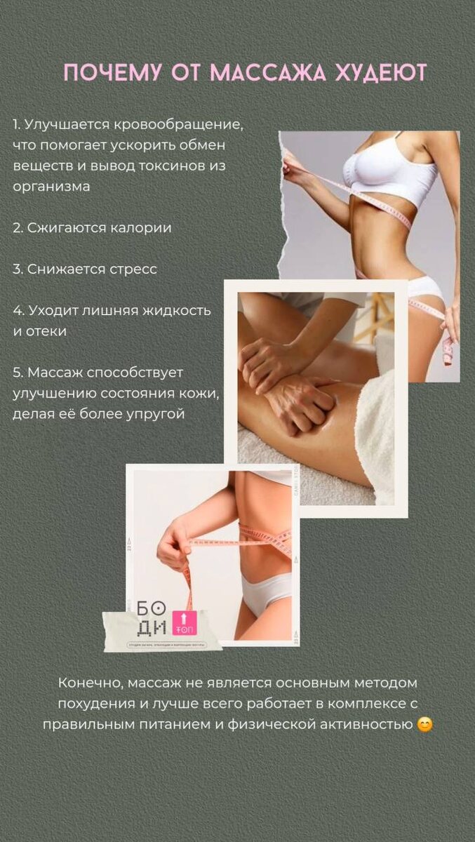 🔥От массажа худеют? Да, если знаешь, зачем идёшь. И НЕ для того, зачем думаешь. Не жди, что тебя «помнут» — и жир убежит. Но вот почему ты можешь стать стройнее: 🔹 Массаж запускает лимфу. Всё, что задерживается в тканях — выводится. Тело перестаёт отекать и выглядит легче. 🔹 Снижается тонус мышц. Расслабленное тело не держит напряжение, а значит — меньше вздутий, зажимов и "лишнего объёма". 🔹 Улучшается пищеварение. Аппарат ЖКТ работает как часы — меньше вздутия, чистота внутри = меньше ложного лишнего веса. 🔹 Падает уровень стресса. Меньше кортизола = меньше тяги к еде, лучше сон, спокойствие в теле. Массаж — не про похудение. Но он создаёт условия, в которых тело начинает худеть само.