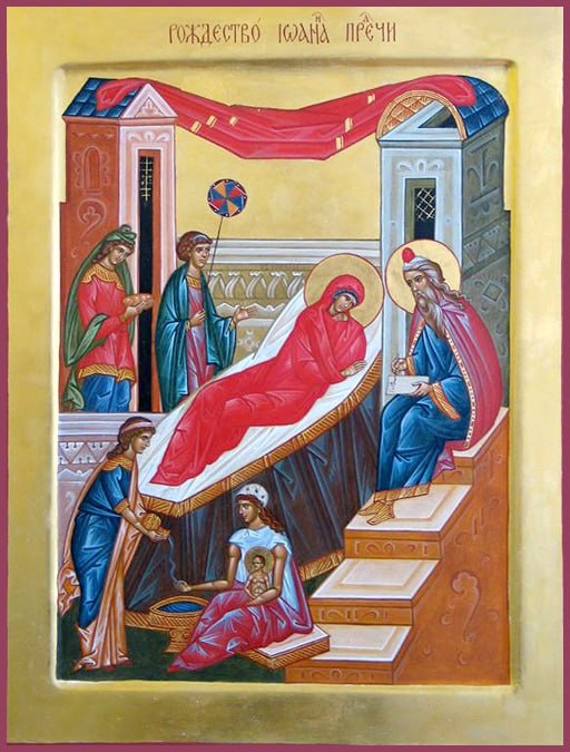 Рождество честно́го славного Пророка, Предтечи и Крестителя Господня Иоанна Когда Незаходимое Солнце правды – Спаситель наш восхотел воссиять миру и уже преклонил небеса и вселился в чистейшую девическую утробу, в это самое время должно было совершиться от неплодной рождение денницы Его – святого Иоанна Предтечи: ему, как провозвестнику, надлежало предшествовать явлению Господа, проповедуя и говоря: "идет за мною Сильнейший меня" (Мк.1:7). И вот, когда исполнилось святой Елизавете время родить, она родила сына в старости своей, от заматоревшей утробы, как в древнейшие времена родила Сарра Исаака. Так одно чудо предваряет другое: прежде чем Дева рождает Христа, заматоревшая во днях своих рождает Предтечу Христова, чтобы видевшие сверхъестественное рождение от состарившейся, поверили и преестественному рождению от небрачной девицы и сказали себе: "всемогущая Десница Божия, разрешившая неплодство старицы, сильна и нетленную Деву соделать чистою Матерью". Потому-то чудесному рождению Спа