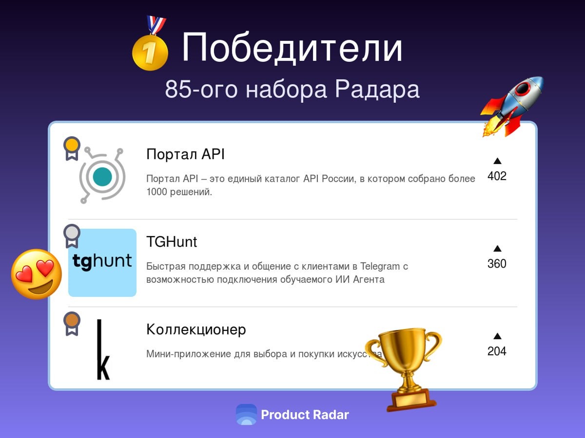 Победители прошлой недели на Радаре 85-й набор 🥇Портал API 🤝 Портал API – это единый каталог API России, в котором собрано более 1000 решений. 🥈TGHunt 🔥🤝 Быстрая поддержка и общение с клиентами в Telegram с возможностью подключения обучаемого ИИ Агента 🥉Коллекционер 🔥🤝 Мини-приложение для выбора и покупки искусства — ⭐️ Вы можете Поддержать Радар на boosty и получить значок «Друг Радара», а также доступ к базе знаний для развития стартапа с нуля — 📤СТАВЬТЕ РЕАКЦИИ: «🎉» – Урааааа! «❤️» – Все участники молодцы «🏆» – Я голосовал(-а) за победителя ⚒️