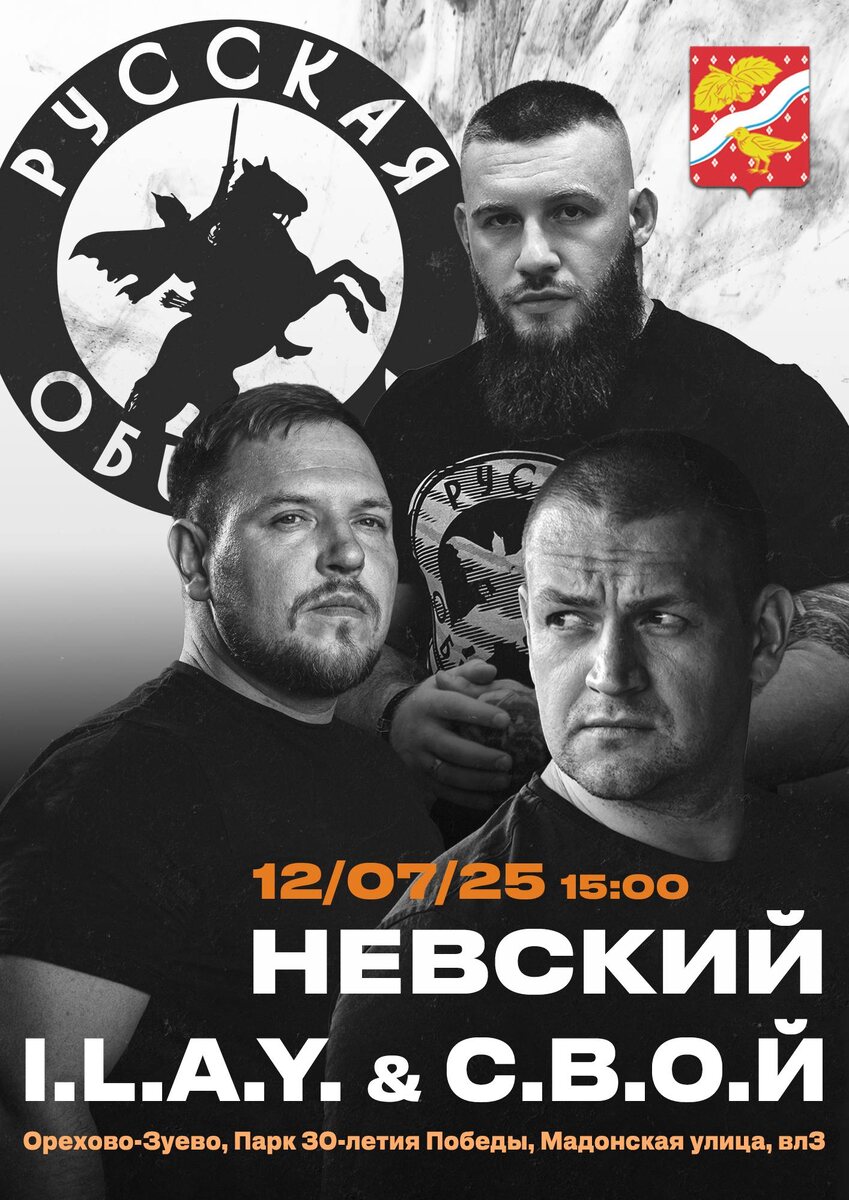 12 ИЮЛЯ | ОРЕХОВО-ЗУЕВО | ПАРК ПОБЕДЫ | 15:00 Большой патриотический концерт в поддержку бойцов при поддержке Русской Общины (Орехово-Зуево), а также презентация трека «Живыми или на щите»!🔥 Вход свободный, ждём вас!🛡️ Подписывайся и слушай🎧 VK | Я.Музыка | Поддержать