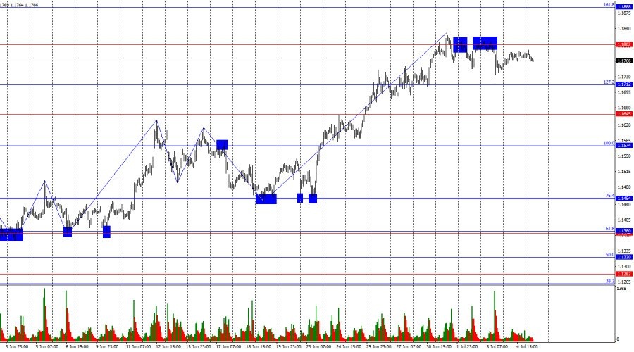 Ситуация с волнами на часовом графике остается простой и понятной. Последняя завершенная волна вниз пробила лоу предыдущей волны, а последняя волна вверх пробила предыдущий пик. Таким образом, в данное время тренд остается «бычьим». Отсутствие реального прогресса в переговорах США с торговыми партнерами и низкая вероятность заключения торговых соглашений с большинством стран вынуждает медведей не…