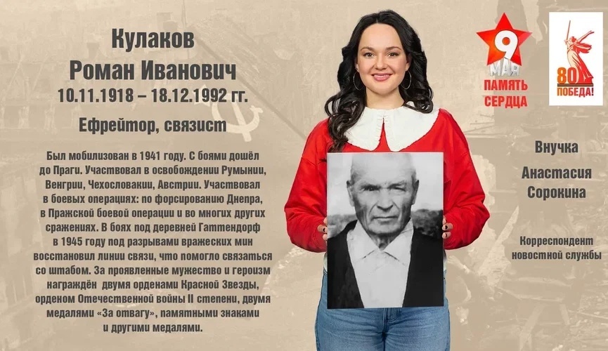 На фронтах Великой Отечественной войны сражался за победу над немецко-фашистскими захватчиками родной дедушка корреспондента новостной службы «МИР 24» Анастасии Сорокиной — ефрейтор, связист Роман Иванович Кулаков.