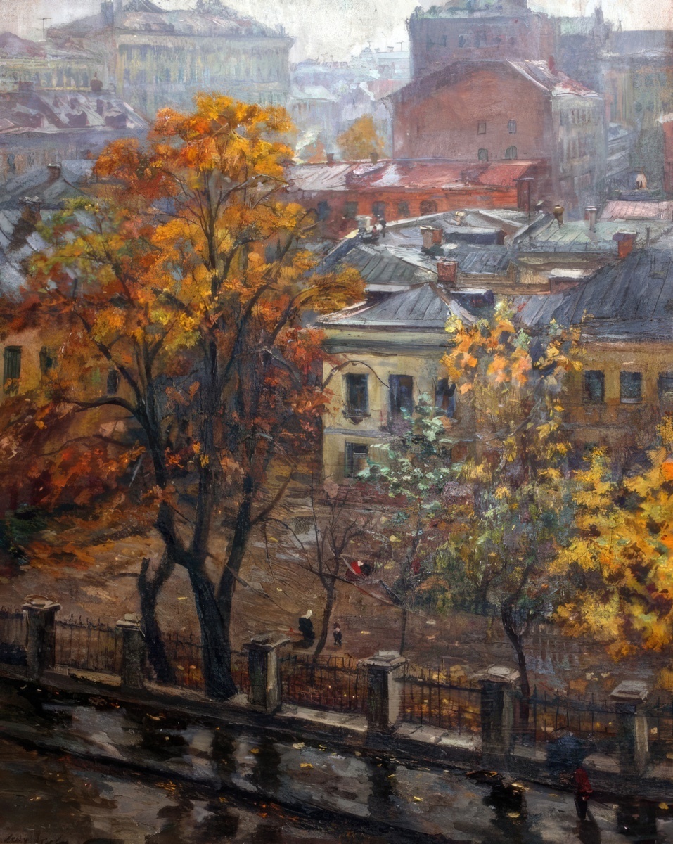 Первая работа этой не слишком известной советской художницы, которую мы увидели, - «Московская осень» 1953 года (оригинал находится в музее города Тюмени). По-моему, замечательно: мокрые крыши и асфальт, палая листва, проблески света в дождливом небе. Пришло на ум слово «петрикор» - именно так называется землистый запах, появляющийся в воздухе после начала дождя. И здесь он чувствуется!