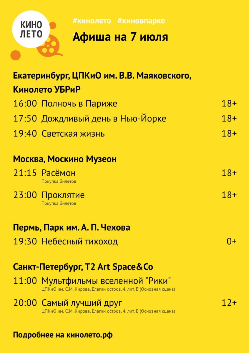 Афиша на 7 июля Возможны изменения, актуальная информация на сайте кинолето.рф Присоединяйтесь к нам https://t.me/cinegramru Обсуждаем кино https://t.me/cinegramru/8 Делимся впечатлениями https://t.me/cinegramru/7 Общаемся https://t.me/cinegramru/27 Наши стикерпаки https://t.me/addstickers/DuhKinoleto https://t.me/addstickers/GhibliMovieHeroes