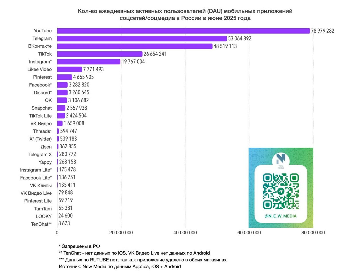 Что-то ну прям никак тн "Индустриальный радиоплейер" не может войти в топ популярных мобильных приложений. Видимо, не хватает тн *Российской Академии Радио" одной мелочи - ещё всего лишь пары десятков миллиардов - и всё должно получиться. Но сначала, в августе, вероятно, ограбят миллионы людей для спасения тонущей корпорации ВК с её новоделом - бывшим ТамТам-ом, вечным недоТелеграмом, объявленным, как российский WeChat, но вообще бесполезным и нефункциональным мессенджером MAX. А потом уж и до радиоплейера очередь дойдёт, если РАО индустрию радио не обанкротит. Ещё чуть-чуть, и наступит обещанное всеми сектами счастливое будущее. Осталось лишь немного потерпеть. ⭐️⭐️⭐️⭐️ 📱📱 Кол-во ежедневных активных пользователей (DAU) мобильных приложений соцсетей/соцмедиа в РФ в июне 2025 года Источник: New Media (https://dzen.ru/id/5e76f21f222104185bb32c45) по данным Apptica, iOS+Android