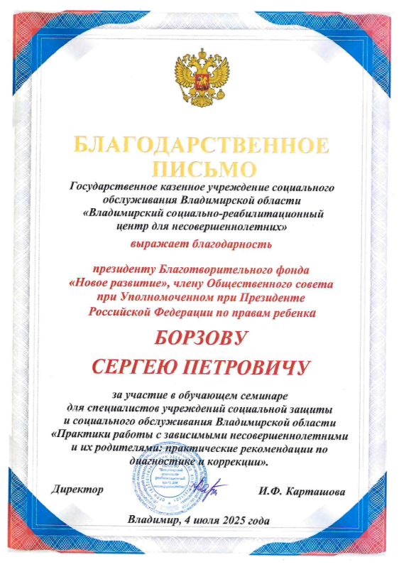 На фото – благодарственное письмо из Владимира. Сергей Борзов, президент БФ "Новое развитие" и директор Центра "Действуем вместе", провёл онлайн-семинар для специалистов, посвящённый работе с семьями, где есть зависимость.