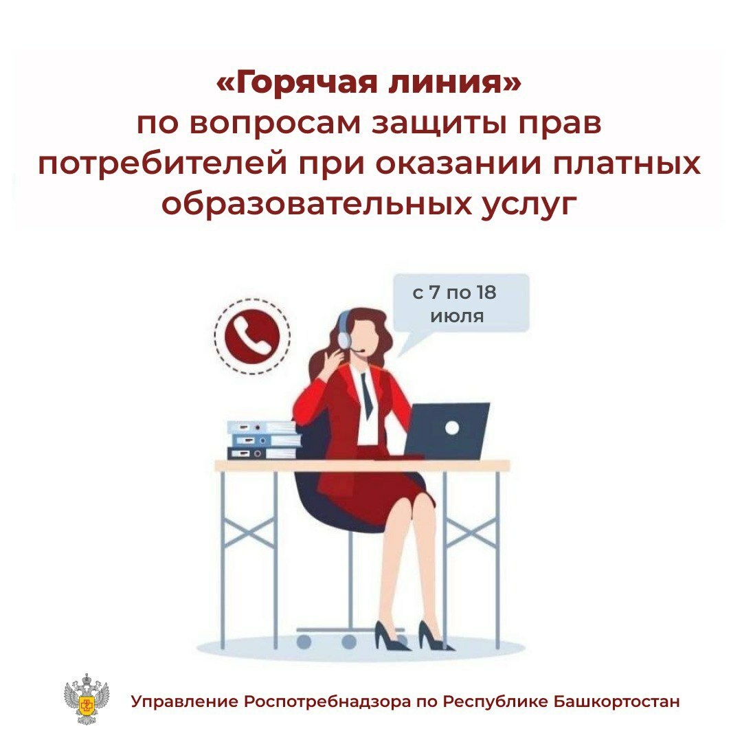 С 7 по 18 июля работает «горячая линия» по вопросам защиты прав потребителей при оказании платных образовательных услуг ☀️Специалисты Управления Роспотребнадзора и Центра гигиены и эпидемиологии ответят жителям республики на все интересующие вопросы по телефону 8-800-77-50-170 понедельник-четверг с 10.00 до 17.00, пятница с 10.00 до 15.45, перерыв на обед с 12.00 до 12.45. 📞В круглосуточном режиме принимает звонки телефон единого Консультационного Центра 8-800-555-49-43 (бесплатно)