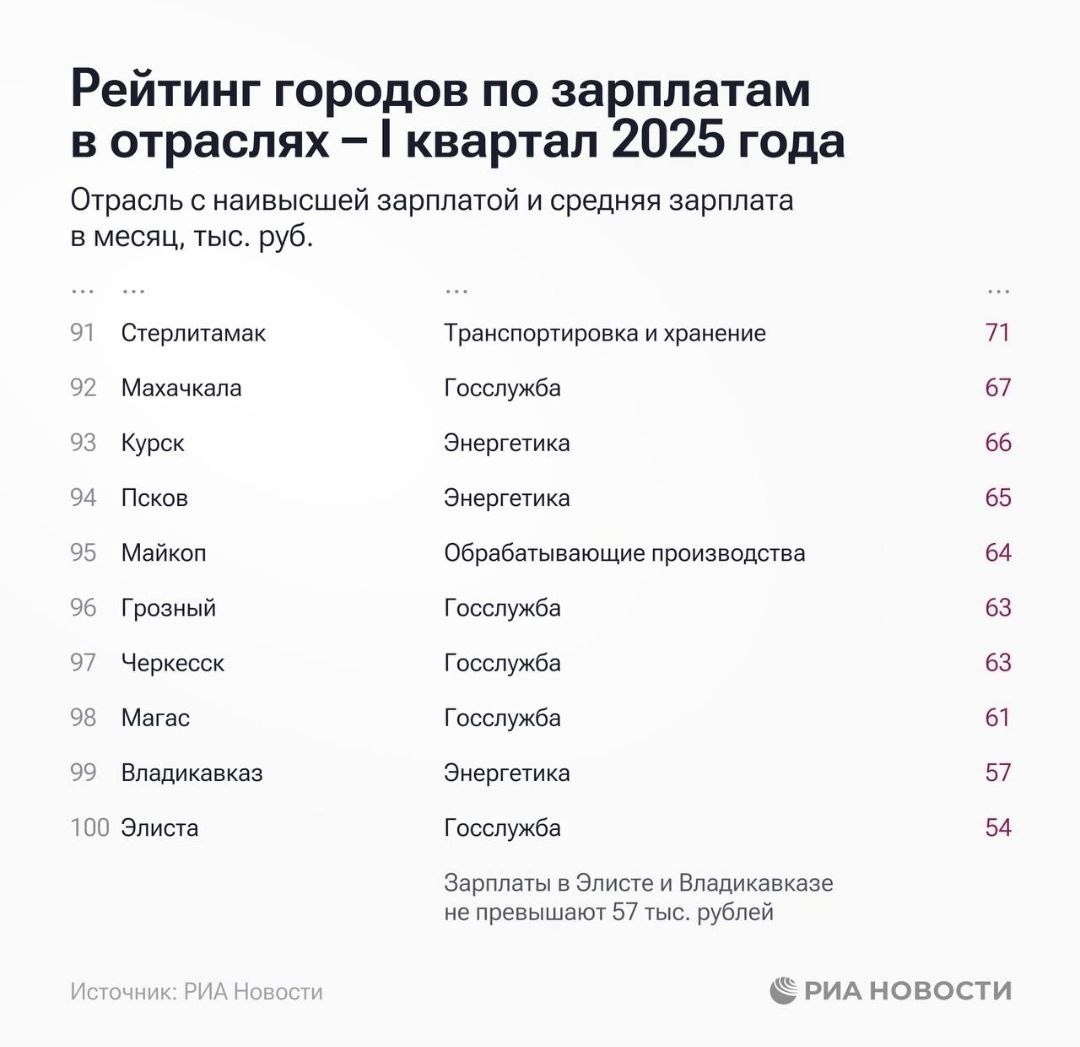 В замыкающей группе - Элиста, Владикавказ и Магас, где зарплаты даже в самых привлекательных отраслях не превышают 61 тысячи рублей. (@alliryston)