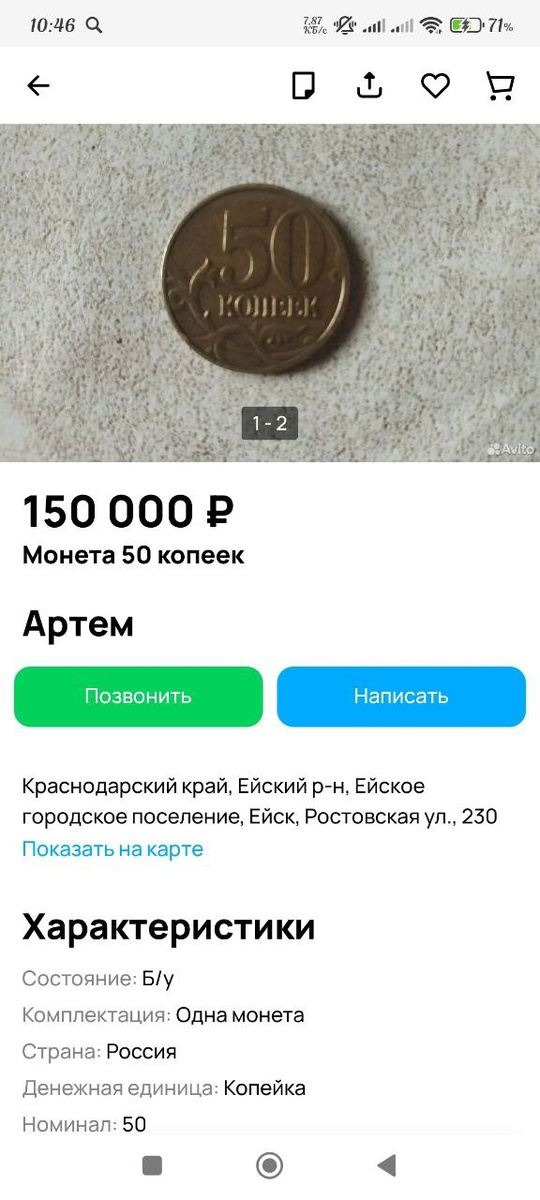 В продаже на Авито за 50 копеек просят 150 000 руб. И это Ейск!!!
