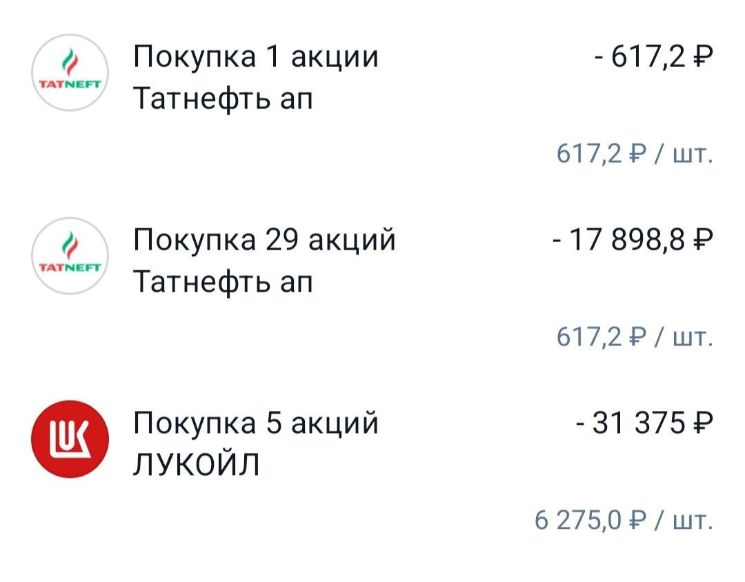Пополнил брокерский счет БКС на 50 тысяч рублей и купил акции РФ компаний. —————————————————— Осуществил пополнение по средствам накопительного счета. После дивидендных отсечек нефтяных компаний котировки снижаются. Добавил в портфель: 1. Лукойл - 5 шт. 2. Татнефть прив. - 30 шт. Компании торгуются по привлекательным ценам, стараюсь добавлять в портфели.