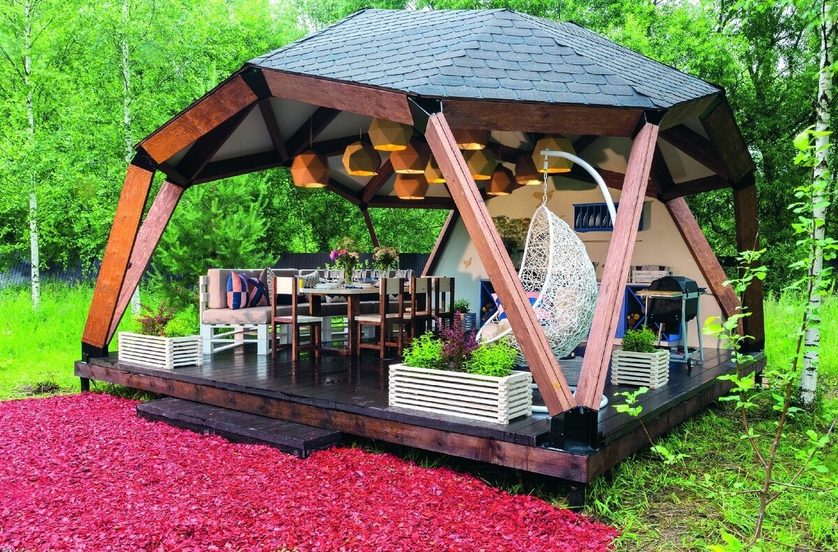 - Беседка или шатер: создайте укрытие от солнца и дождя с помощью беседки или шатра. Там можно размещать мягкие диваны и подушки для комфортного отдыха.