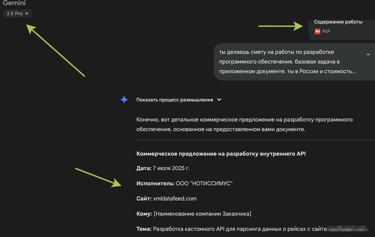 Дальше экспорт в Google.Docs, мелкая шлифовка и все - можно слать клиенту. Советую использовать только думающую модель, которая ваш промпт еще улучшит (у меня Gemini 2.5 Pro).