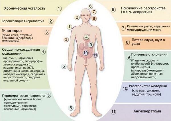 "Мусор" (Gb3) начинает накапливаться, как невывезенный хлам, внутри клеток по всему телу. Особенно страдают: