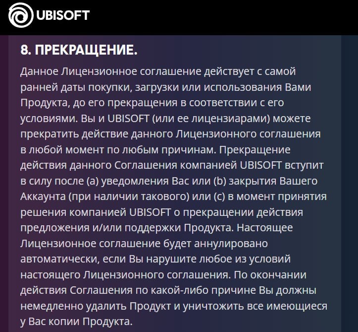Ubisoft меняет правила игры: теперь вы не владеете даже тем, что купили Ubisoft обновила пользовательское соглашение, и теперь в нём чёрным по белому: компания может в любой момент расторгнуть договор с игроком — без объяснения причин. После этого пользователь обязан удалить все игры со своих устройств, иначе Ubisoft оставляет за собой право подать в суд. Кроме того, студия официально закрепила за собой возможность менять содержимое игр без предупреждения. То есть вы можете купить один продукт — а через месяц получить другой, хуже. И никаких уведомлений. В эпоху цифровых лицензий Ubisoft вновь напомнила: вы не покупаете игру, вы лишь арендуете её до первого каприза издателя.