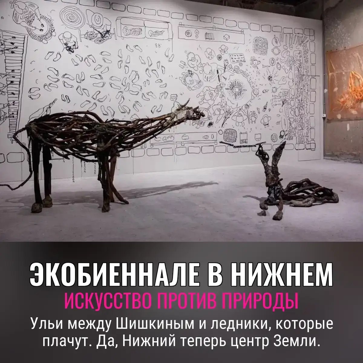 Сенсация века: впервые в мире экобиеннале устроили именно в Нижнем! 100+ художников из 35 стран закидывают наш индустриальный город арт-работами о том, как мы же гробим родную планету. Местный Мытный рынок превращают в пустыню плача по почве, гостиница Ермолаевых — в храм богине-матери Природе, а айтишники имитируют таяние ледников генеративными звуками, потому что, ну… наше будущее оно такое цифровое и морозное. Вишенка на торте: ульи среди картины Шишкина — злая сатира на нашу заботу о природе. Бесплатно посмотреть во всех локациях и припасть к истокам можно до конца лета 👀., Следите за новостями 📩
