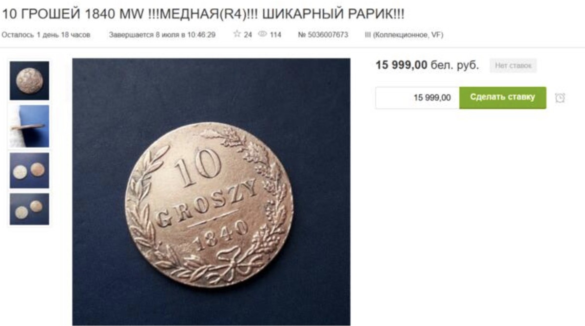 На интернет-площадке ay.by появилось объявление о продаже уникальной монеты номиналом 10 польских грошей, отчеканенной в 1840 году. Владелец оценил редкий лот в 15 999 белорусских рублей. Согласно информации из объявления, монета была выпущена Варшавским монетным двором. Особенность экземпляра заключается в материале — медь. Продавец предполагает, что это могла быть пробная чеканка, что делает монету особенно ценной. Медные 10 грошей 1840 года относятся к категории R4, что означает, что существует менее десяти таких экземпляров. При этом аналогичные монеты из серебра стоят значительно дешевле. Продавец отметил, что монета находится в хорошем состоянии (VF — Very Fine), хотя и имеет небольшие следы износа. Для подтверждения материала монету аккуратно очистили от темной патины. Начальная цена лота составляет 15 999 рублей. Торги завершаются 8 июля, на момент публикации заметки ставок еще не поступало. Дополнено Ситуацию прокомментировал научный сотрудник Академии наук Всеволод Юргенсон.