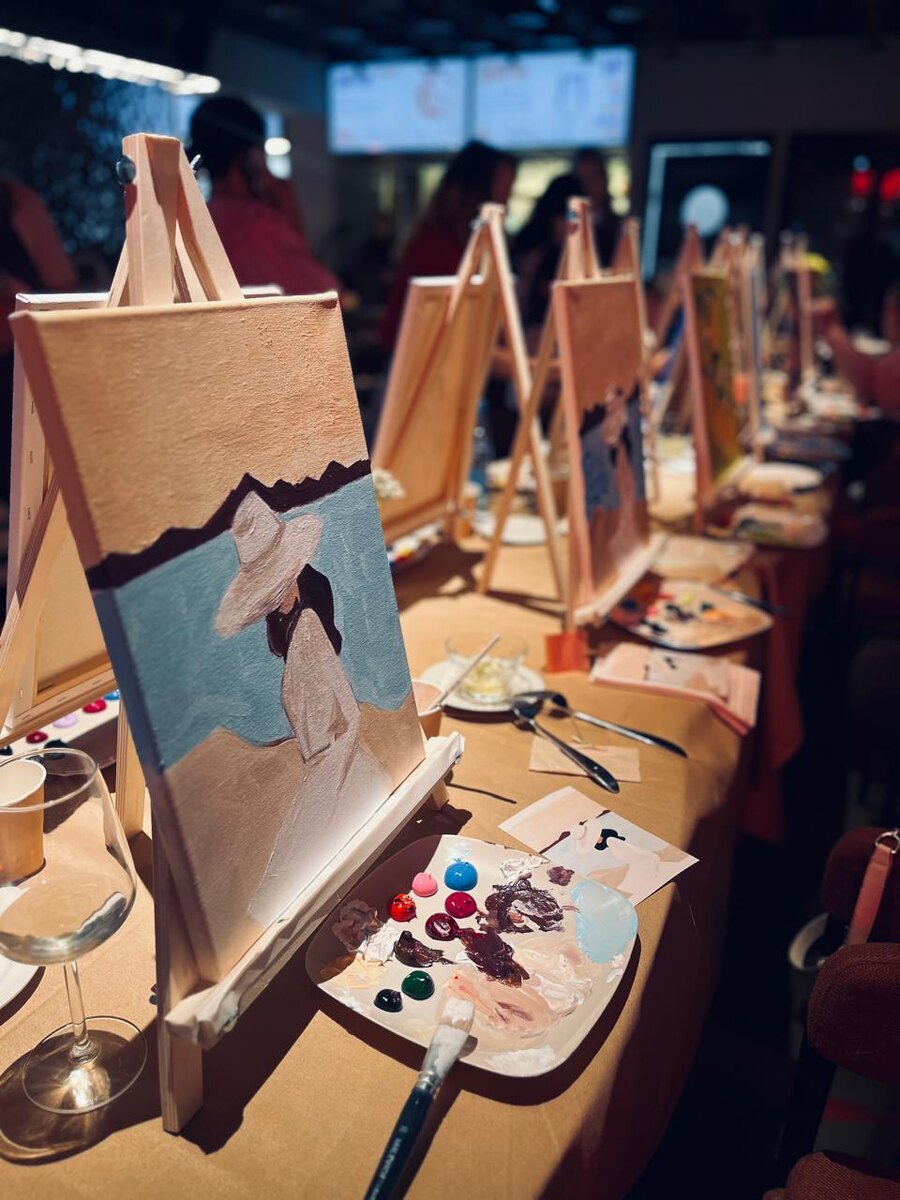 Войдя после целого рабочего дня в ресторан и увидев выстроившиеся в ожидании очаровательных художниц мольберты, я уже ощутила прилив адреналина и предвкушение. Я немного волновалась, потому что не пробовала ранее свои силы в таком творчестве, но совершенно напрасно. Девушки, ведущие мастер-класс, сумели создать непринужденную обстановку, простыми словами объяснили задачу и пообещали всячески способствовать ее выполнению. Так и случилось. Наставницы уделили столько времени каждой из участниц, сколько было необходимо, никого не подгоняли, не торопили. Все происходящее было в максимально дружелюбной обстановке.