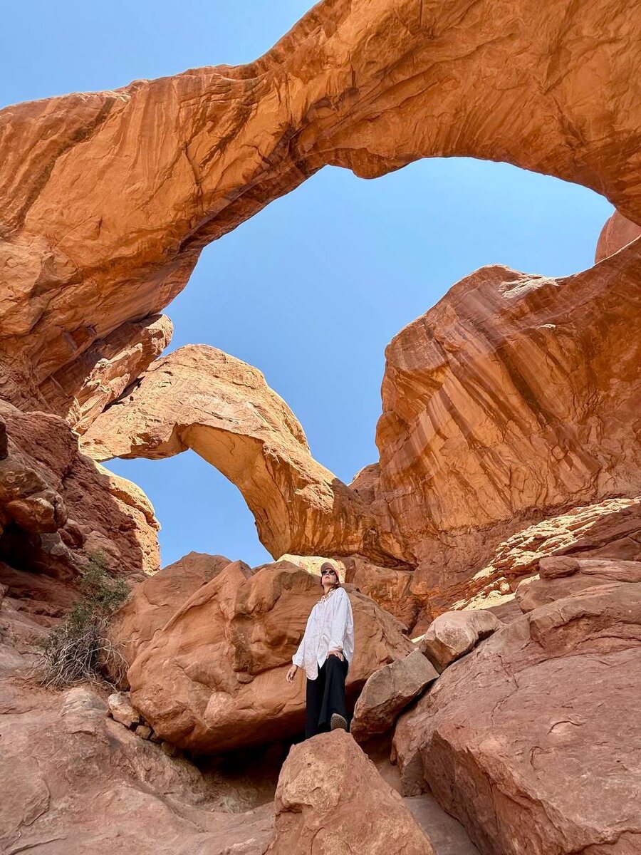 Arches National park. 🏜️ Возвышающиеся своды арок и гулкое эхо создают впечатление природного храма — каждая арка как алтарь, освещённый солнцем. ☀️ Хорошо просто посидеть там в зной… С национальным парком Arches наше путешествие из пустынь плавно перетекло в прерии. Мы уже начали скучать по зелёному цвету. 🏡 Всё это время мы пересекали одноэтажную Америку, двигаясь на север. Нью-Йорк, Лос-Анджелес, Вашингтон — эти имена известны каждому. А слышали ли вы про Пейдж, Афтон, Эванстон, Джексон, Моаб, Грейс, Престон, Кук? Я — нет. Пока не посетила их. Это Америка с бескрайними дорогами, фермами, старыми мотелями и вывесками “Jesus Saves” (церкви здесь встречаются чаще чем школы), с коренным местным населением, одетым в ковбойскую одежду (и это не сцена фильма), историями про медведей гризли, которые разгуливают по ночам, и другим невероятным колоритом. Продолжение следует …