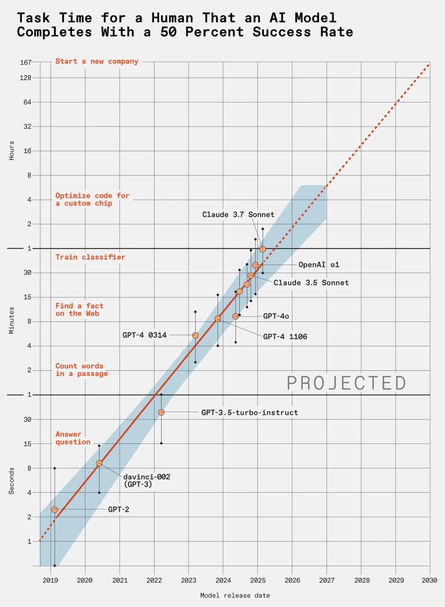 Гленн Зорпетт в свежем номере IEEE Spectrum рассказывает, как развиваются большие языковые модели (LLM) - их возможности растут: каждые семь месяцев они удваиваются... ! См. картинку, она кликабельная. К 2030 году такие модели смогут за часы справляться с задачами, на которые человеку нужен месяц (167 рабочих часов). Например, написать роман, запустить стартап или даже улучшить другую модель ИИ. Но есть нюанс: чем "запутаннее" задача, тем сложнее ИИ с ней справляется, особенно если это что-то из реального мира, а не просто код. Исследователи из METR в Калифорнии придумали метрику "горизонт времени выполнения задачи" - сколько времени человеку нужно, чтобы сделать то, что ИИ выполняет с 50% надежностью. И вот что пугает автора (не меня): если рост продолжится, к 2030 году ИИ сможет заменить человека в сложных проектах. Но есть и загвоздка - прогресс могут затормозить ограничения в железе ... Я уверен, что в ИТ профессия программиста и дизайнера сильно изменится. Русский ИТ бизнес