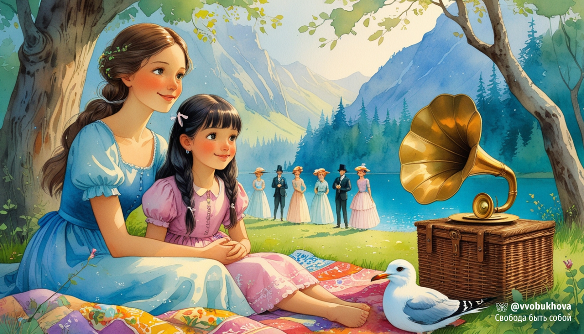 Бризвиль, горное озеро, 7 июля Тётя Эля ворвалась на кухню, как летний бриз — в смешной соломенной шляпе и с таинственным блеском в глазах. Она наклонилась ко мне и заговорщицки прошептала: — Знаешь, что сегодня за день? — перехватила мой недоуменный взгляд, пока я доедала тост с вишнёвым джемом. — Единственный день в году, когда прошлое выходит на пикник! Сегодня идеальный день для того, чтобы сбить с толку парочку привидений. Едем на горное озеро! Пока я удивлённо хлопала глазами, она уже вытащила из кладовки плетёную корзину, старинный граммофон с огромной медной трубой, которая блестела, словно её только что отполировали. И бутыль лимонада, которая запотела от холода. Через полчаса мы уже тряслись в её стареньком автомобиле, похожем на ржавую консервную банку, который она называла «Морская Черепаха». Корзина с арбузами от дяди Миши и плед лежали в багажнике, а громоздкий граммофон тётя Эля устроила на заднем сиденье, как почётного пассажира. — И всё-таки, зачем он нам? — не унимала