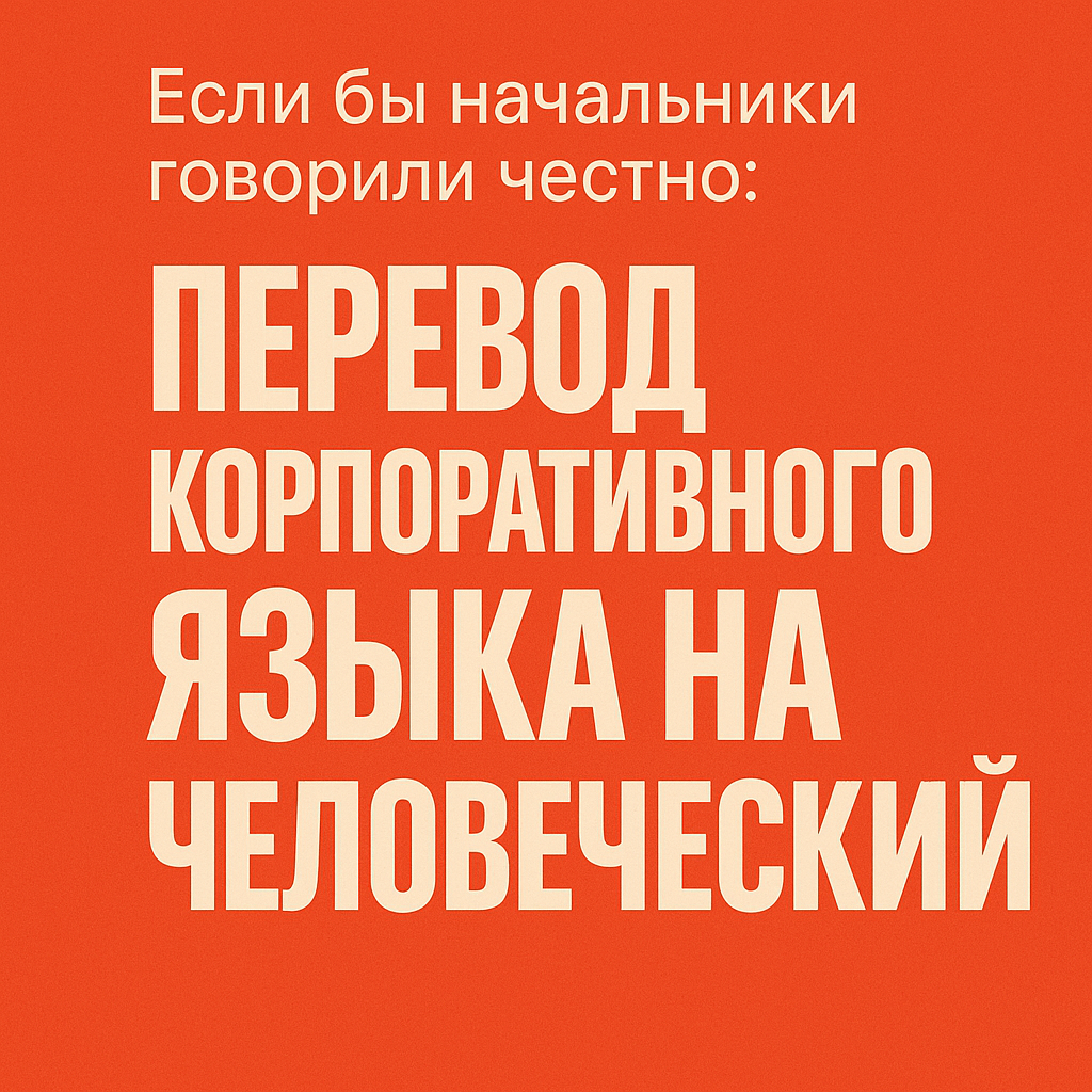 Давай честно переведём канцелярит на человеческий — просто для профилактики выгорания. Перевод: «Ты работаешь как осел, но мы хотим, чтобы ты делал это с искрами из глаз и ещё сам просился на переработки». Перевод: «Найди проблему, которой нет, предложи десять решений, сам всё сделай и не мешай нам отдыхать». Перевод: «Результат плохой, но мы надеемся, ты не уйдёшь, если об этом красиво сказать». Перевод: «Мы боимся, что ты уйдёшь. Но повышения не будет». Перевод: «Ты работаешь всегда. Просто теперь ещё и с чувством свободы». Перевод: «Не лезь не в своё дело. У нас уже всё придумано». Перевод: «Сделай это вчера. И желательно без лишних вопросов». Перевод: «Мы свалим на тебя что-то неприятное. Надеемся, ты не откажешься». Перевод: «Ты будешь работать за троих и приходить по выходным. Но с улыбкой». — «Слушай, я сам не знаю, что делать, но мы попробуем»