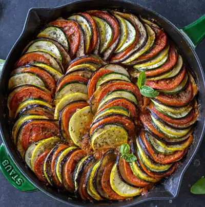Ничто не сравнится с рататуем, только что вынутым из духовки! Овощи можно есть холодными или тёплыми - они вкусны в любом виде. Это отличное блюдо на ужин. В этом запечённом рататуе овощи просто идеально сочетаются с чесночным томатным соусом. Обязательно попробуйте его приготовить. Вот рецепт рататуя. Продукты необходимые для его приготовления: три столовых ложки оливкового масла одна маленькая луковица, нарезанная один болгарский перец, нарезанный кубиками четыре зубчика чеснока измельчить 400 г консервированных помидоров, нарезанных кубиками одна чайная ложка соли две чайных ложки итальянской приправы один небольшой баклажан нарезанный кружочками толщиной 3 мм один средний кабачок нарезанный кружочками толщиной 3 мм один средний цукини нарезанный кружочками толщиной 3 мм три помидора нарезанные кружочками толщиной 3 мм. Время приготовления: 1 час 30 минут. Все нужные продукты собраны. Начинаем готовить рататуй в духовке. 1. Разогрейте духовку до ста девяносто градусов. В большой ско