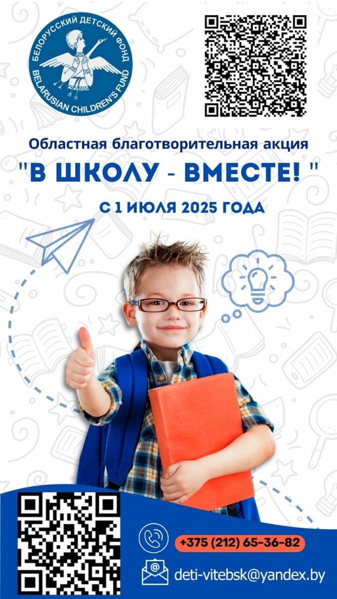 🧒Ежегодная благотворительная акция «В школу – вместе!» стартовала в Витебской области 💙Ее организатором выступает Витебское областное отделение Белорусского детского фонда. 📌Если вы хотите принять участие в акции и помочь детям, попавшим в трудную жизненную ситуацию, собраться в школу, обращайтесь по телефону +375(212)65-36-82. ➡️ Акция «В школу – вместе!» продлится до 30 сентября.