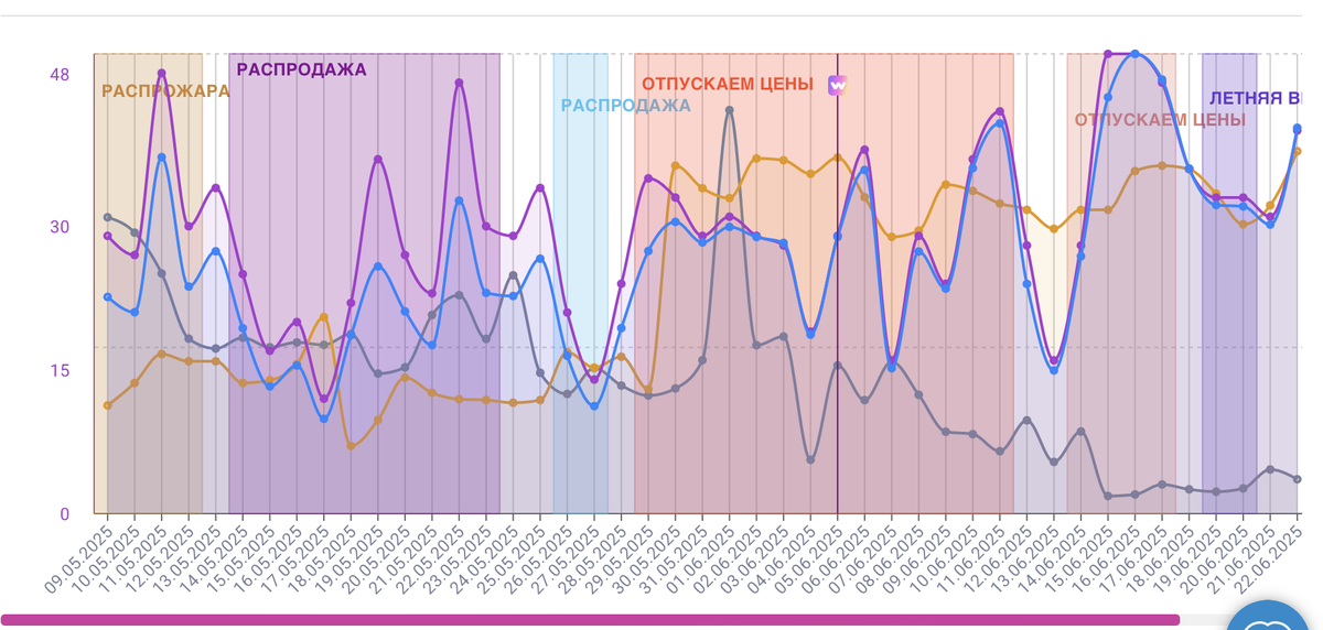 Я часто работаю с прямыми поставщиками. Это немного другая история, чем с перепродажей: ты сам производишь, сам везёшь, сам отвечаешь за весь цикл. И если товар не продаётся — ты не перекладываешь ответственность на логиста, упаковщика или маркетплейс. Ты просто смотришь на цифры и понимаешь, что где-то что-то упустил. С этим селлером мы работаем первый раз и закуп был тестовым. Но важное уточнение - тестовым он был для клиента, а я уже работала с похожим товаром и очень точно понимала, что и как нам надо делать. Товар — маски для лица. Хорошая себестоимость, правильный состав, аккуратная упаковка. Отличный товар для внешки. И вроде бы всё ок, но в какой-то момент продажи начали проседать. Сначала было ощущение, что просто «лето, спад, сезон». Потом — что внешняя реклама не сработала. Но когда мы зашли в аналитику, всё встало на свои места. Органика, на которую раньше можно было полагаться, просто исчезла. Те, кто говорит о 30–35% органики на Wildberries, просто не открывали графики в