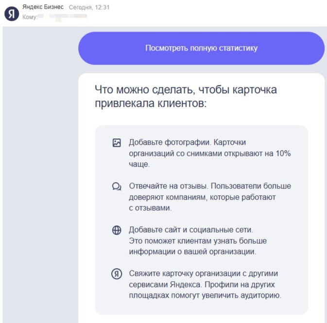 Открываю письма от Яндекс.Бизнеса — «Статистика за неделю