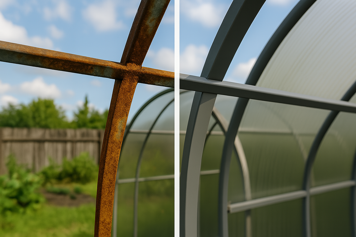 Один из частых вопросов у дачников: нужно ли красить каркас парника? Ответ — однозначный: да, и чем раньше — тем лучше. Металлическая основа, даже самая прочная, со временем поддаётся коррозии: сначала появляются ржавые пятна, потом — крошится труба, теряется несущая прочность. А в парнике условия особенно агрессивные: влага, конденсат, удобрения, перепады температур, контакт с землёй. Если хотите, чтобы ваша теплица стояла не 2–3 сезона, а 7 лет и больше, — без покраски не обойтись. Металл сам по себе не вечен. Даже если каркас оцинкован, он всё равно нуждается в защите. А если это обычная черная труба или профиль — тем более. Вот что происходит без окрашивания: И это не просто косметическая проблема. Парник становится небезопасным. Главное правило: выбираем только атмосферостойкие антикоррозионные составы. Не интерьерные, не фасадные универсальные — а именно те, что предназначены для защиты металла на улице. 💡 Идеальный вариант, если у вас старый каркас с ржавчиной или нет времени н